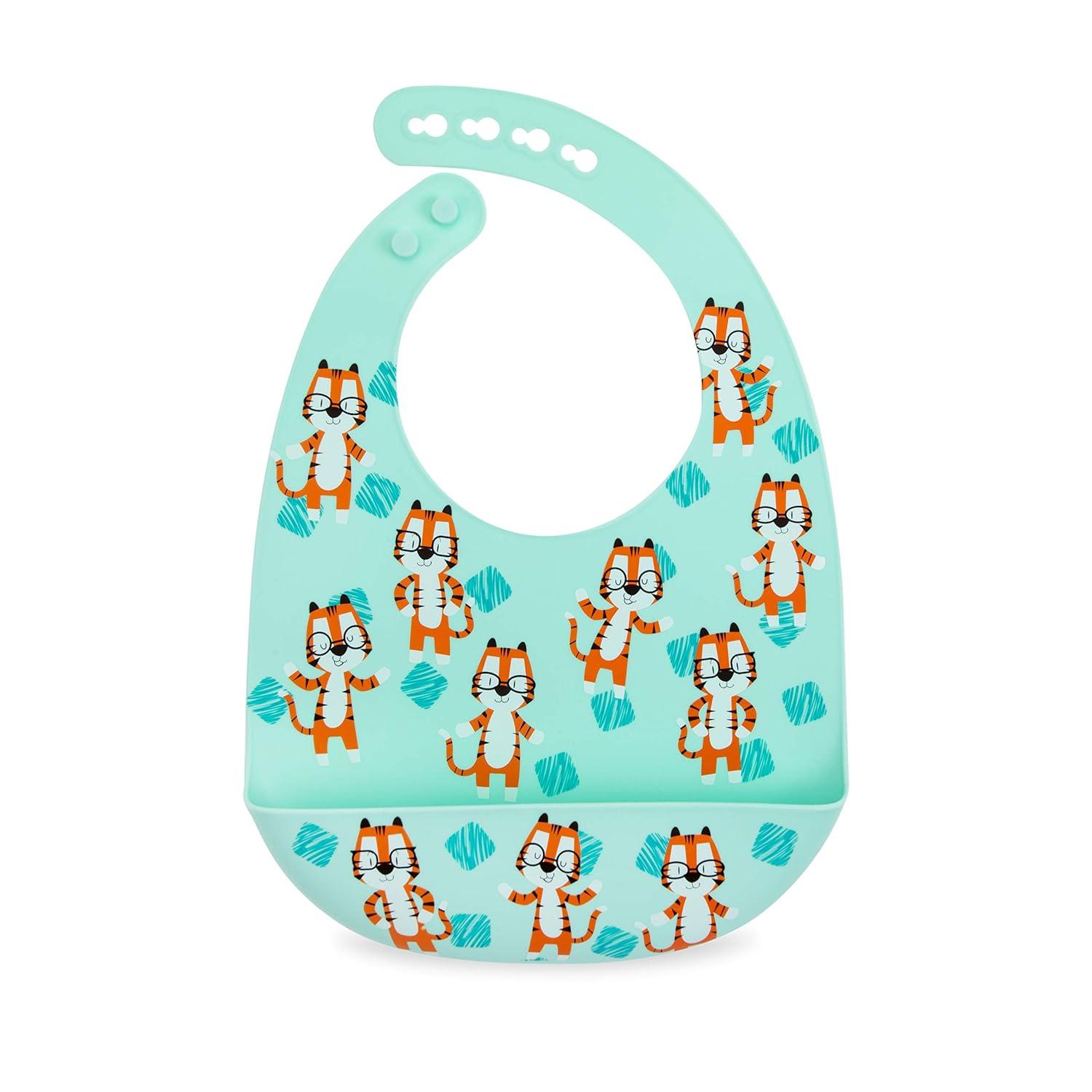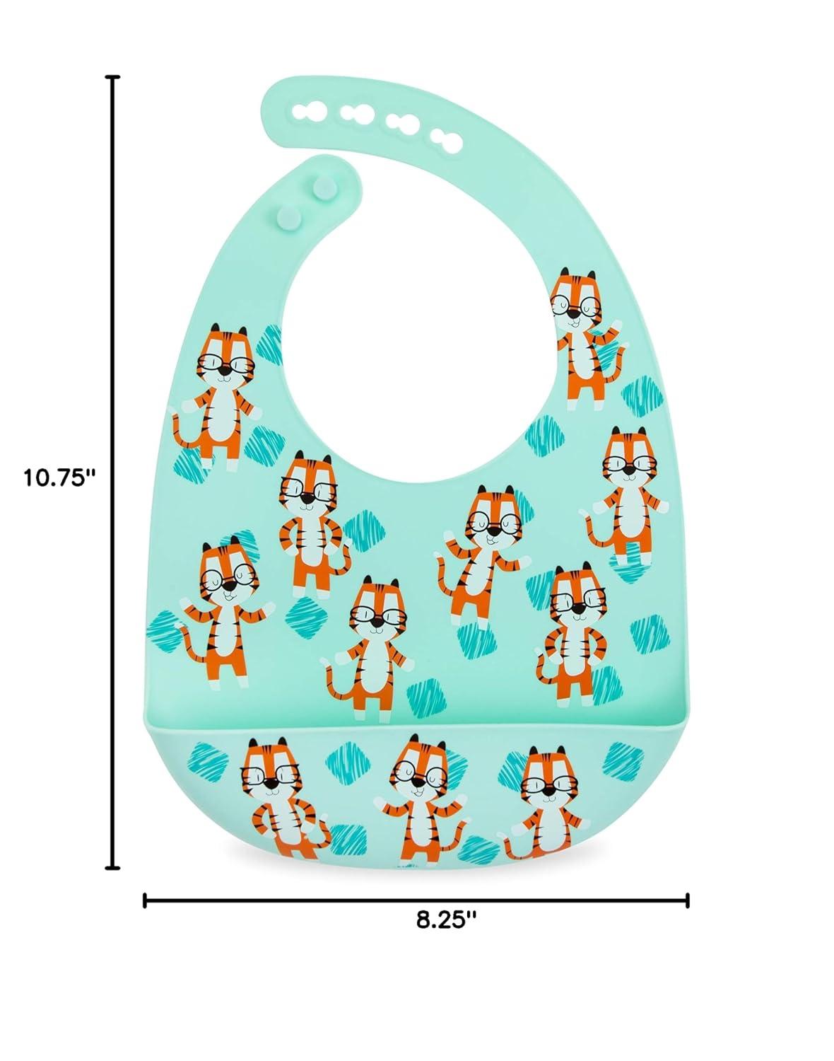 Nuby 2 Pack Adjustable Easy Clean Soft Silicone Bibs with Scoop, Triangles & Dinosaurs(Tigers & Squares)