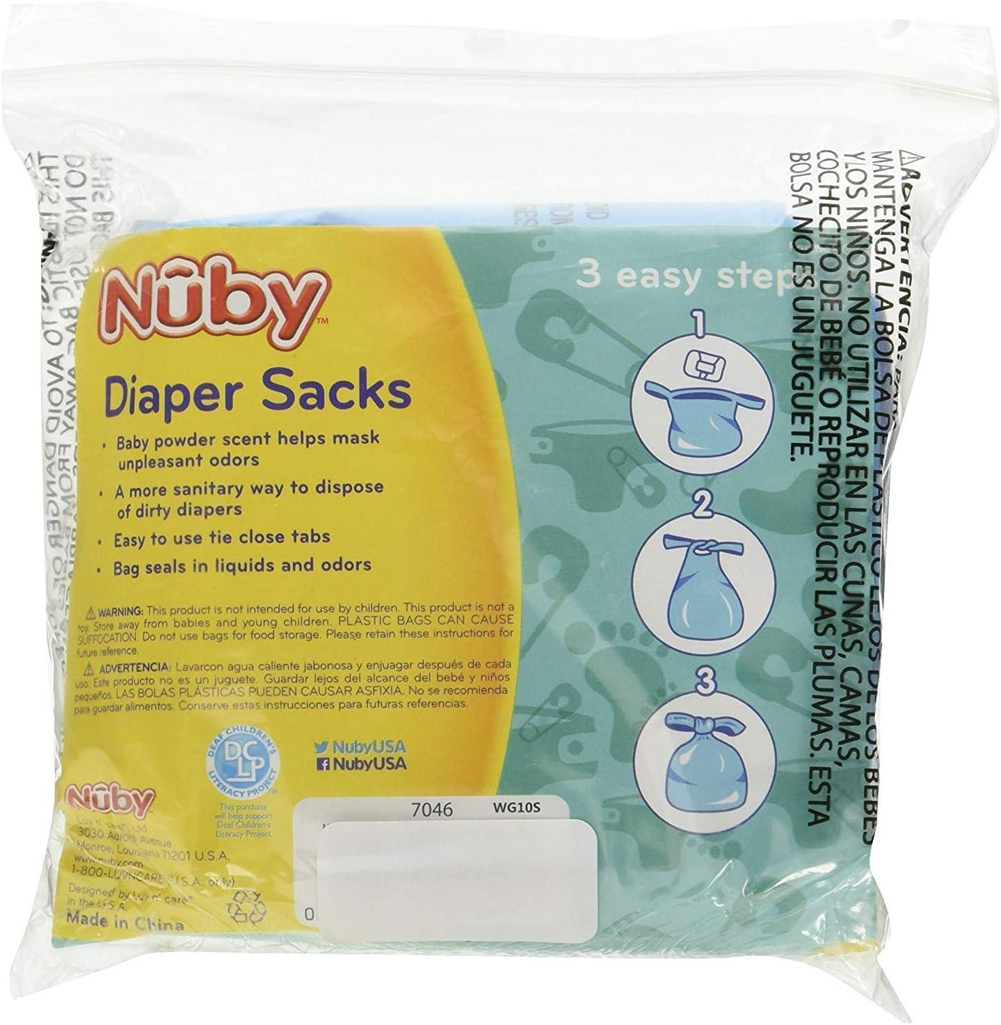 Let's face it: dirty diapers are stinky. No ifs, ands, or… butts. So we designed Nuby Diaper Disposable Bags to keep your house clean and free of any unpleasant odors. With our bags, we offer a more sanitary way to dispose of dirty diapers. The easy tie-close tabs make it easy for you to seal in any smells and easily secure the bag. Plus, the light baby powder scent helps mask the smells coming from the dirty diaper. These diaper trash bags seal in liquids and odors with easy-to-use tie-close tabs. This item includes 50 baby powder-scented diaper sacks that are great for on-the-go or at home.