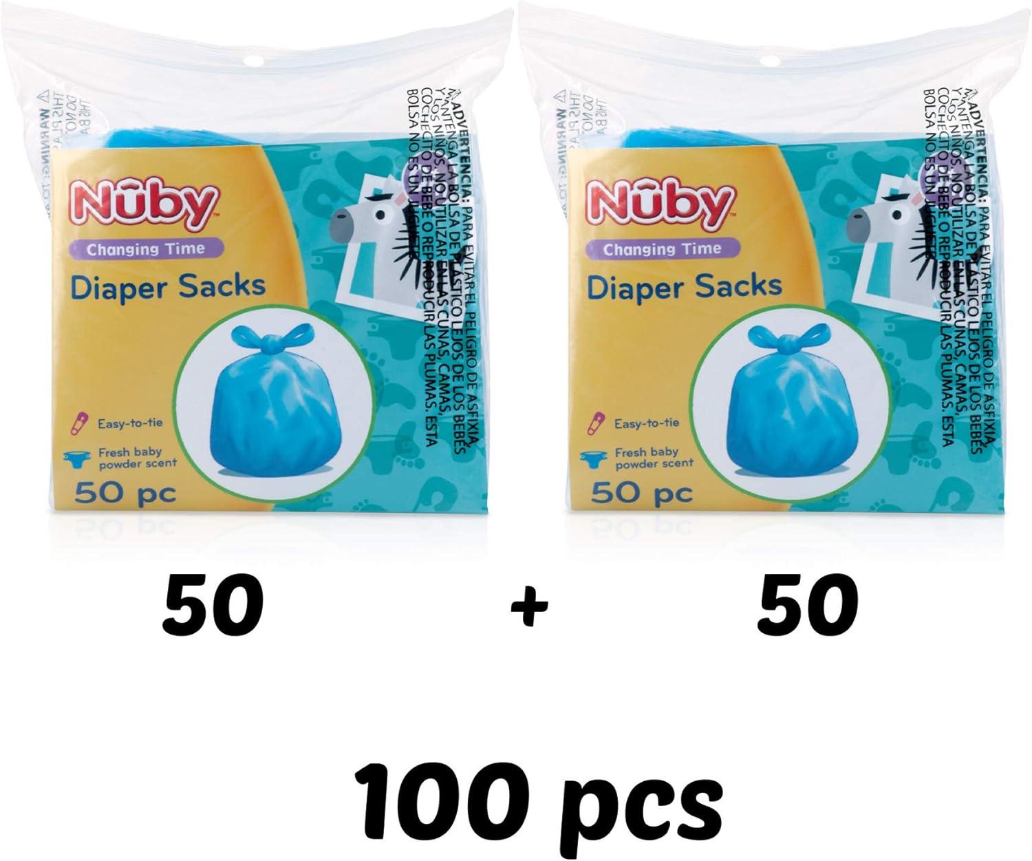 Let's face it: dirty diapers are stinky. No ifs, ands, or… butts. So we designed Nuby Diaper Disposable Bags to keep your house clean and free of any unpleasant odors. With our bags, we offer a more sanitary way to dispose of dirty diapers. The easy tie-close tabs make it easy for you to seal in any smells and easily secure the bag. Plus, the light baby powder scent helps mask the smells coming from the dirty diaper. These diaper trash bags seal in liquids and odors with easy-to-use tie-close tabs. This item includes 50 baby powder-scented diaper sacks that are great for on-the-go or at home.