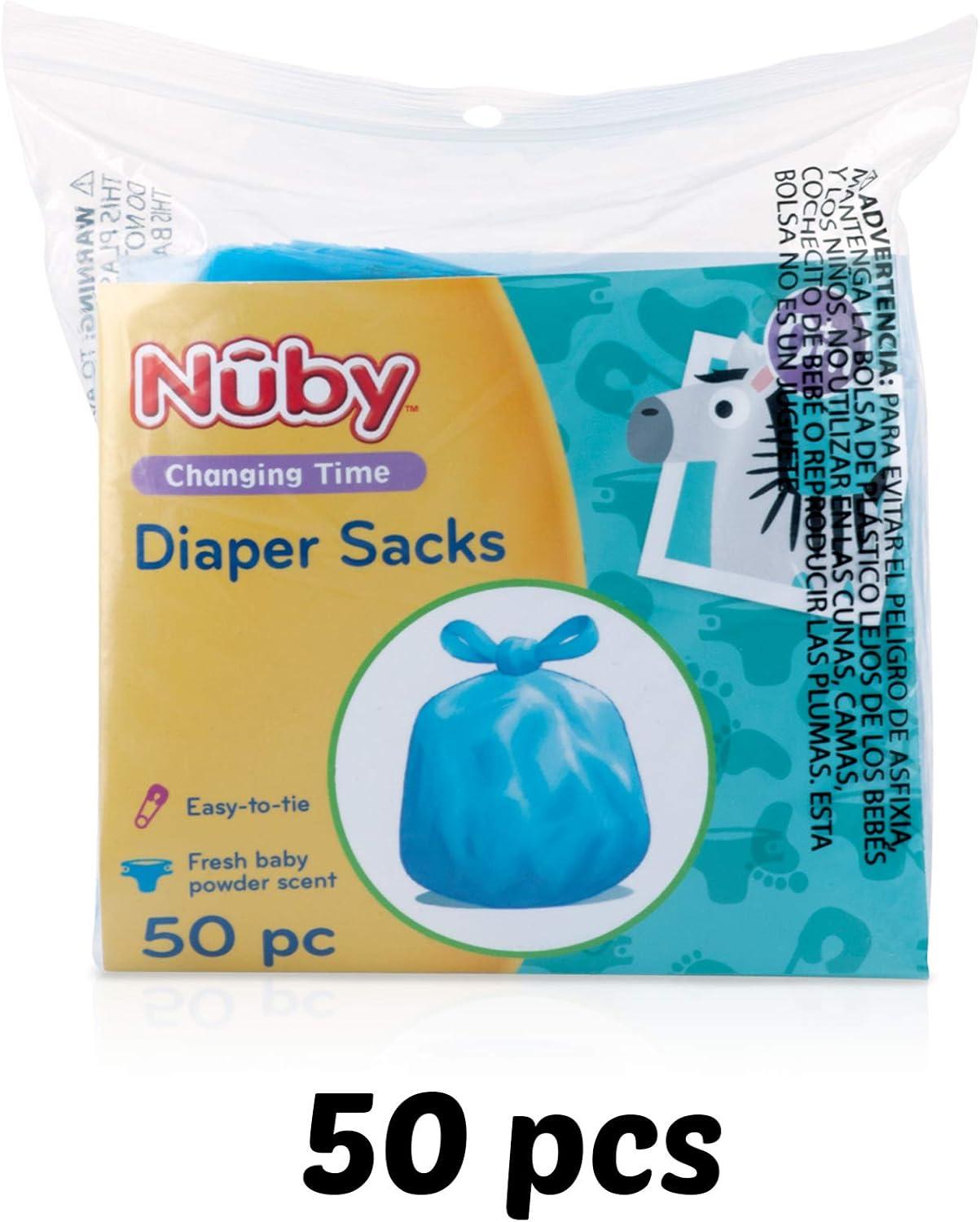 Let's face it: dirty diapers are stinky. No ifs, ands, or… butts. So we designed Nuby Diaper Disposable Bags to keep your house clean and free of any unpleasant odors. With our bags, we offer a more sanitary way to dispose of dirty diapers. The easy tie-close tabs make it easy for you to seal in any smells and easily secure the bag. Plus, the light baby powder scent helps mask the smells coming from the dirty diaper. These diaper trash bags seal in liquids and odors with easy-to-use tie-close tabs. This item includes 50 baby powder-scented diaper sacks that are great for on-the-go or at home.