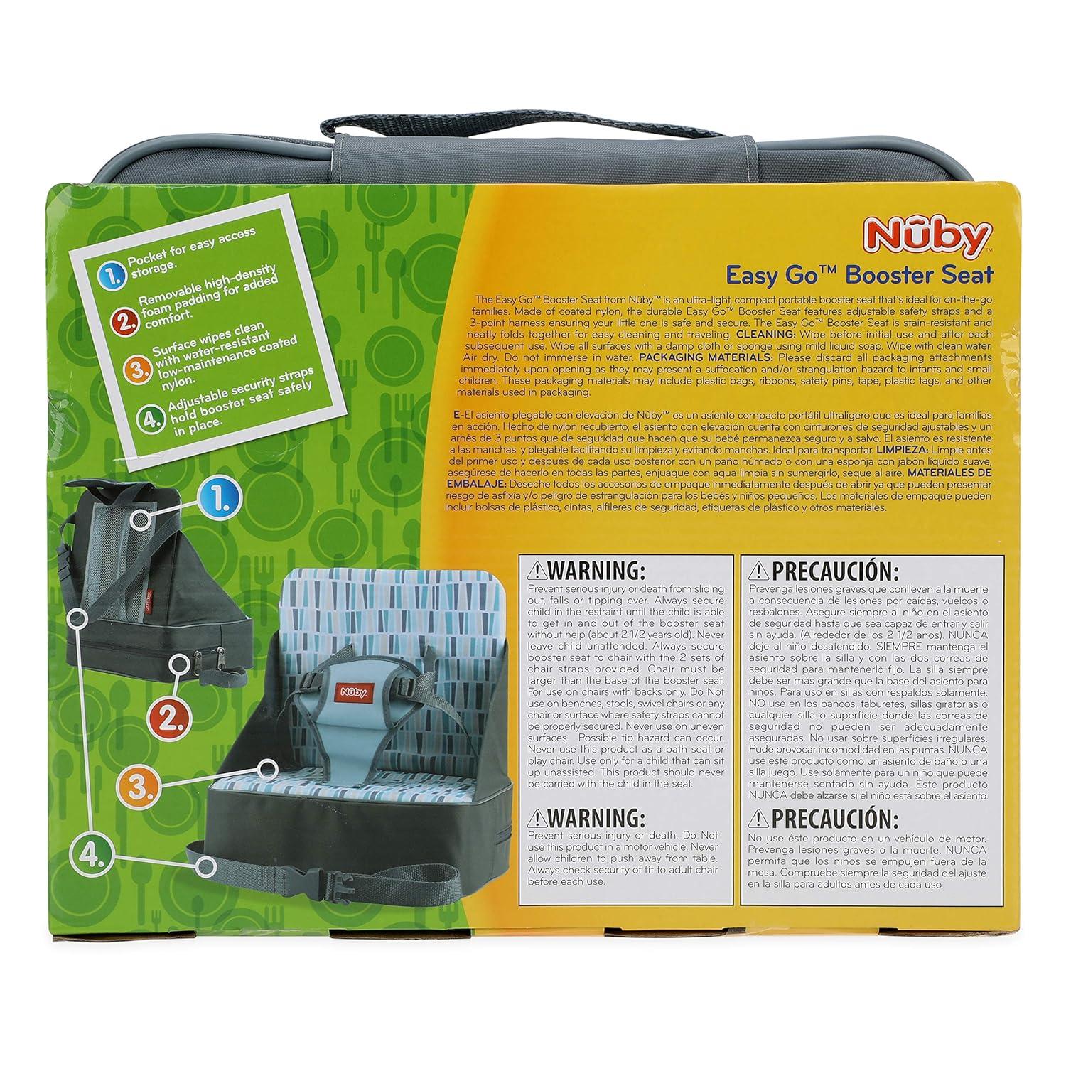 The Nuby Easy Go Booster Seat is a lightweight, compact, and portable booster seat designed with safety, convenience, and comfort in mind. The Nuby Easy Go Seat features adjustable safety straps and a three-point harness to ensure your little one is safe and secure, and removable foam padding for customizable comfort for your child. This portable high chair easily collapses, making the small booster seat perfect for travel, and features an easy-access pocket for added convenience. Plus, its durable and low-maintenance coated polyester surface easily wipes clean and is water- and stain-resistant. Go Easy with Easy Go!