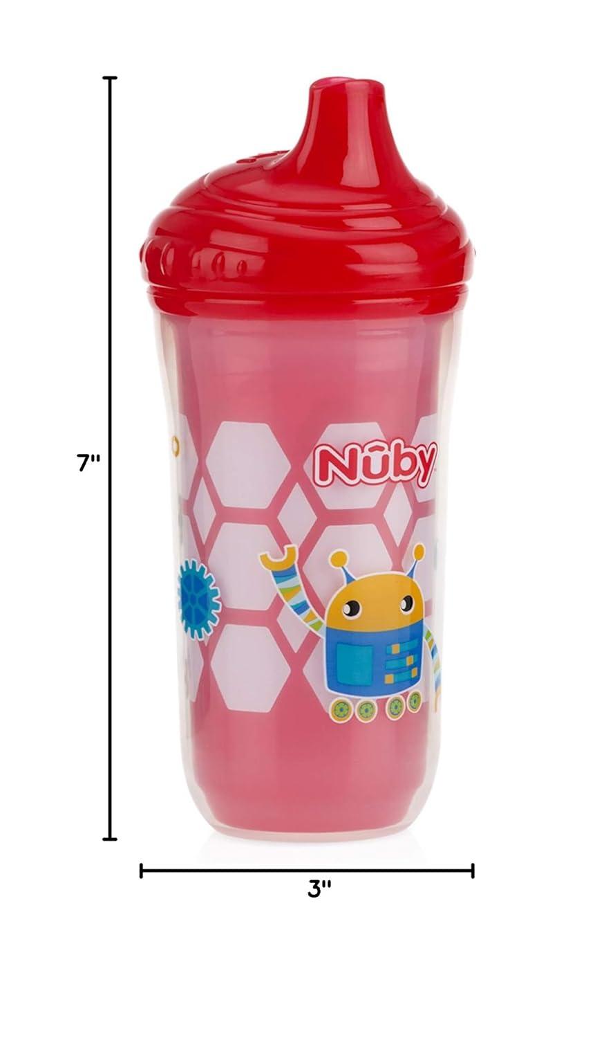 Nuby’s No-Spill Insulated Easy Sip Cup uses double-wall insulation to keep liquids fresh and cool, while also protecting furniture from a “sweating” cup. Designed to make drinking and handling easier, the No-Spill Insulated Easy Sip Cup is sized to fit your child's grasp. It's made of safe, durable materials and comes in a variety of colors and patterns that will delight your child. The No-Spill hard spout features a Vari-Flo valve system engineered to help protect against spills or leaks. Liquids pass through the spout only when your child sips. The bite-proof hard spout is constructed to hold up to chew-prone little ones. Nuby’s No-Spill Insulated Easy Sip Cup holds up to 9oz/270ml of liquid so children will have no problems staying hydrated. Stay spill-free and secure in your decision to use Nuby’s No-Spill Insulated Easy Sip Cup.
