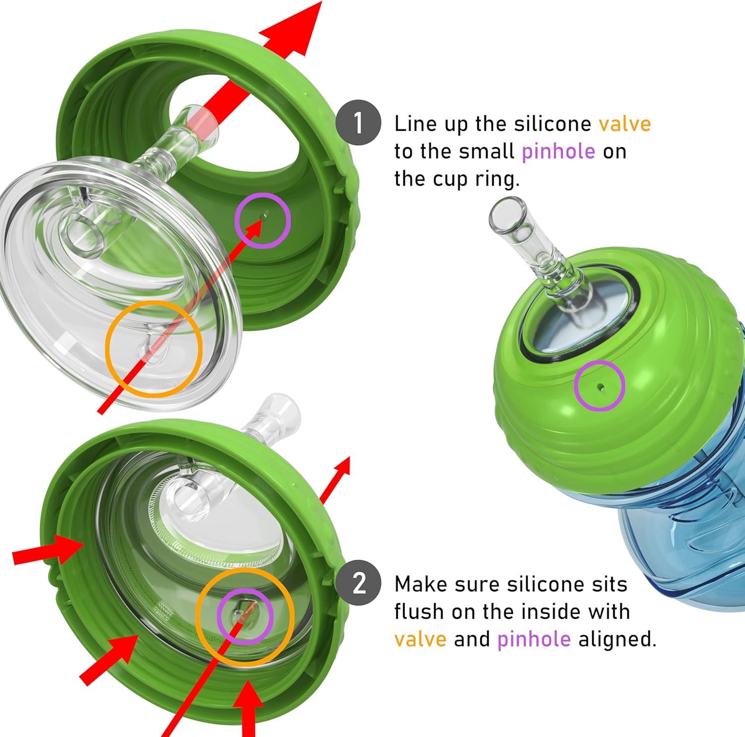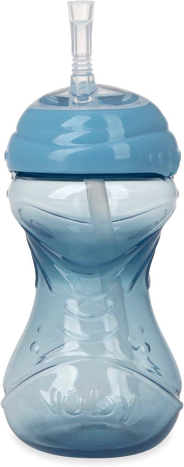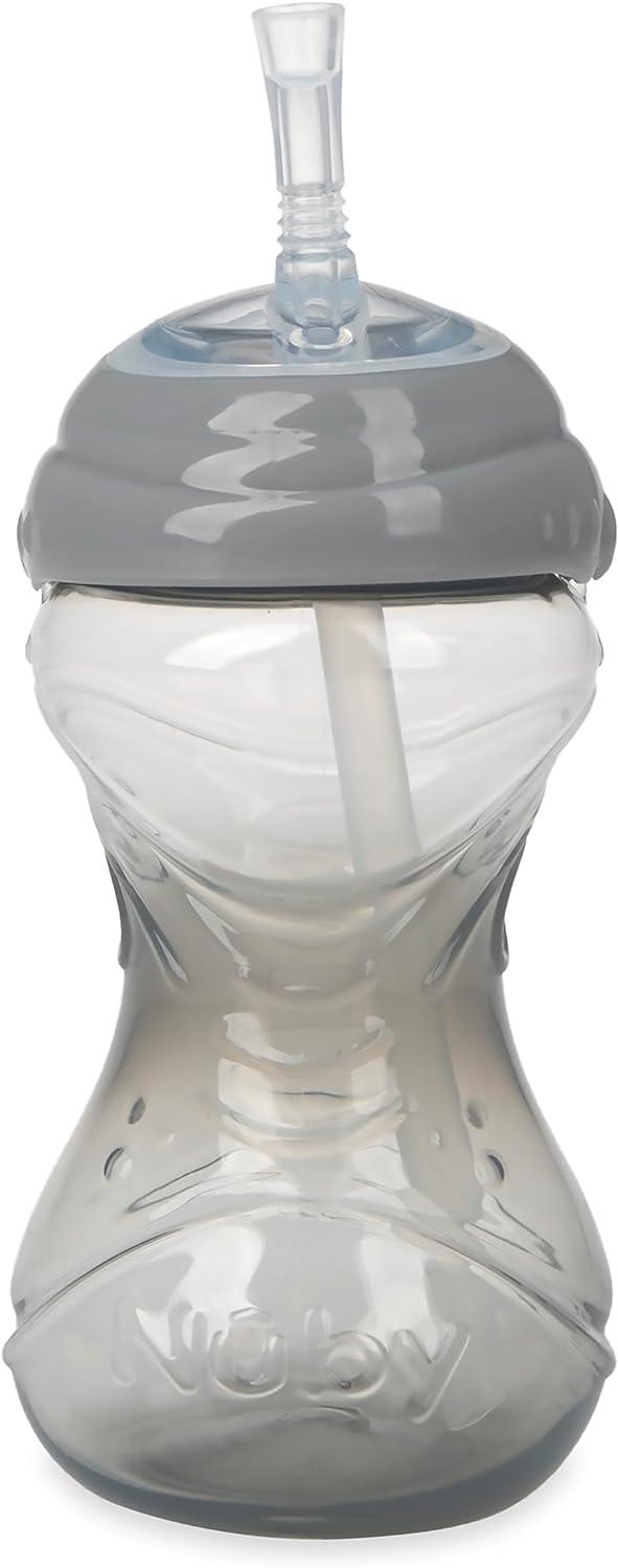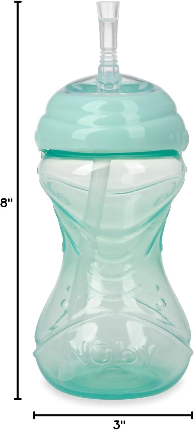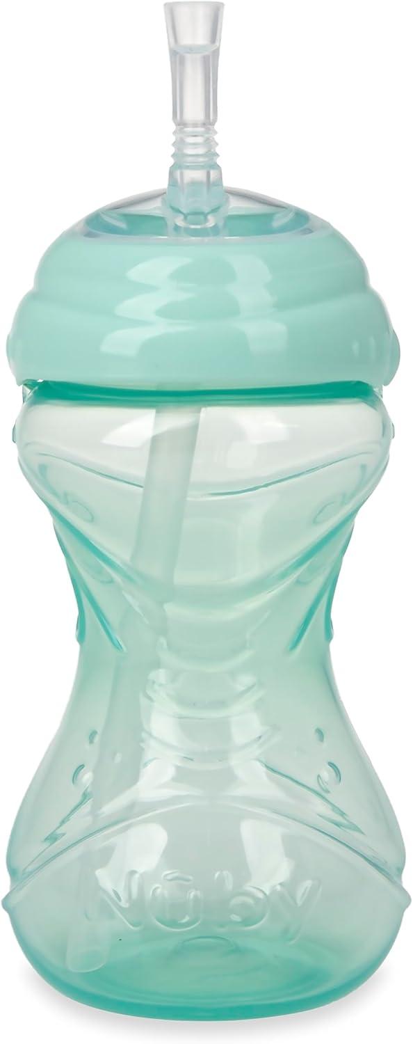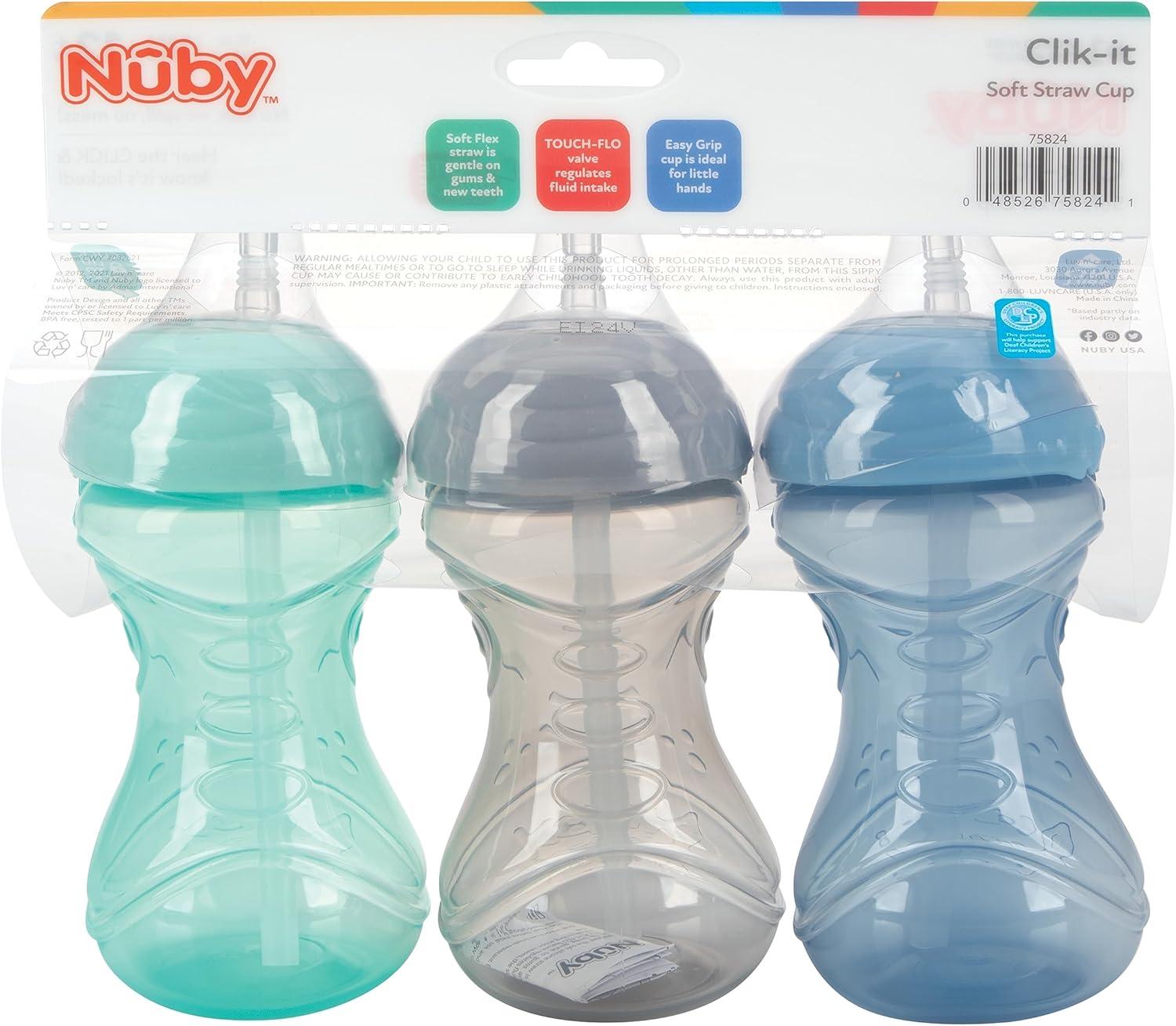 The Nuby No-Spill Easy Grip Cup with Soft Flex Straw is great for travel and on-the-go sipping. Designed for toddlers 12+ months, the Nuby No-Spill Easy Grip Cup features a soft silicone straw that is gentle on children's teeth and gums and an Easy-Grip base contoured for little hands. The soft straw is designed with our pressure-sensitive TOUCH-FLO valve to help prevent drips and spills, opening only with the pressure from their mouth. Each cup holds 10 ounces (300 mL) of liquid. This set of three includes one orange sippy cup, one blue sippy cup, and one green sippy cup. Avoid the messy clean up of spills and leaks with the Nuby No-Spill Easy Grip Cup with Soft Flex Straw!