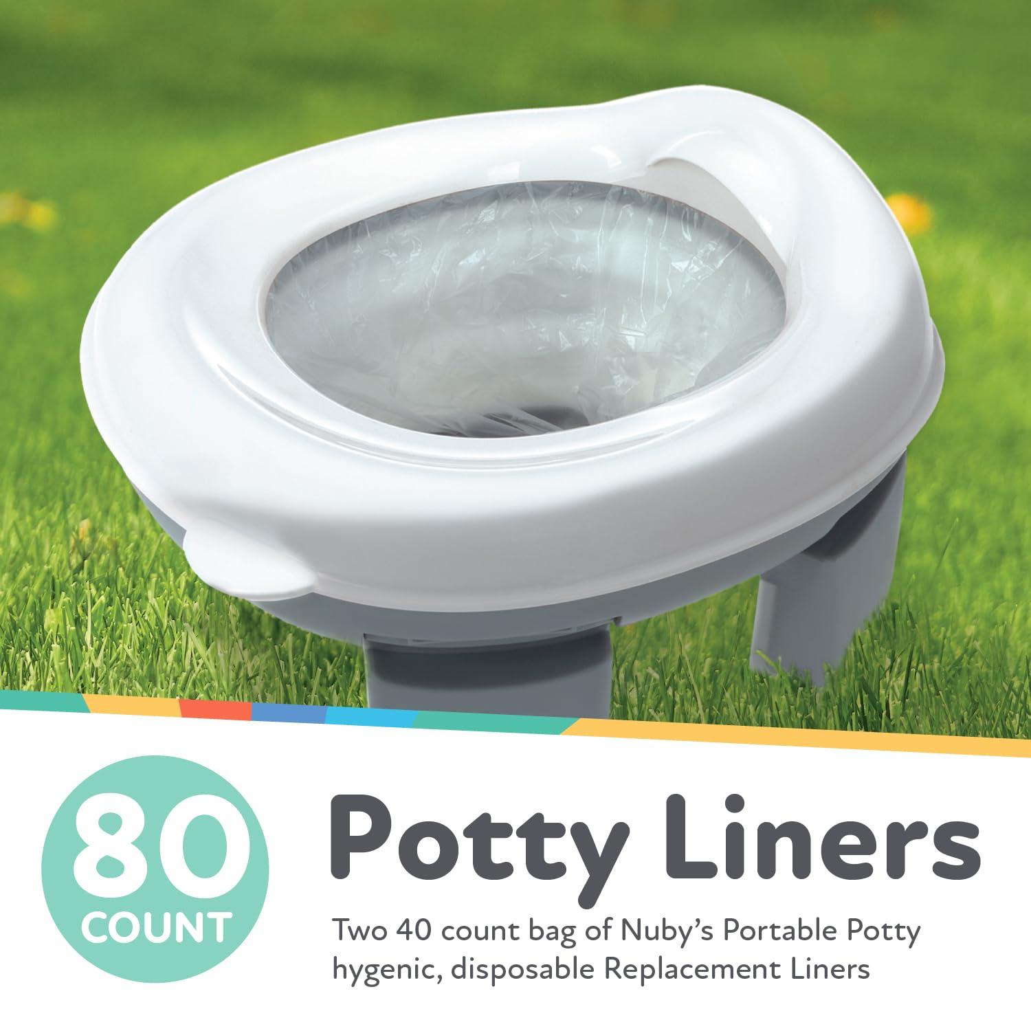 80 COUNT REPLACEMENT POTTY LINERS: Two bags of 40-count Nuby's Portable Potty Replacement Liners so you're prepared anytime, anywhere