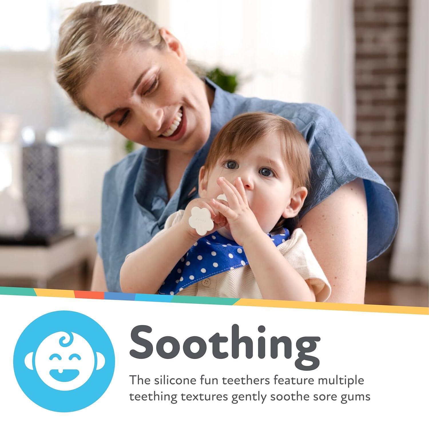 Ease your baby's teething discomfort with Nuby's Silicone Fun Teethers. Designed to make teething easier, these teethers feature multi-textured surfaces that encourage tactile exploration and provide gentle massage to soothe sore gums. Crafted from 100% soft silicone, they offer teething relief without causing discomfort to delicate mouths. The vibrant colors, playful shapes, and intriguing textures of these teething toys appeal to your baby's senses, stimulating both sight and touch. With their perfect size, they are easy for little hands to grasp and hold securely.