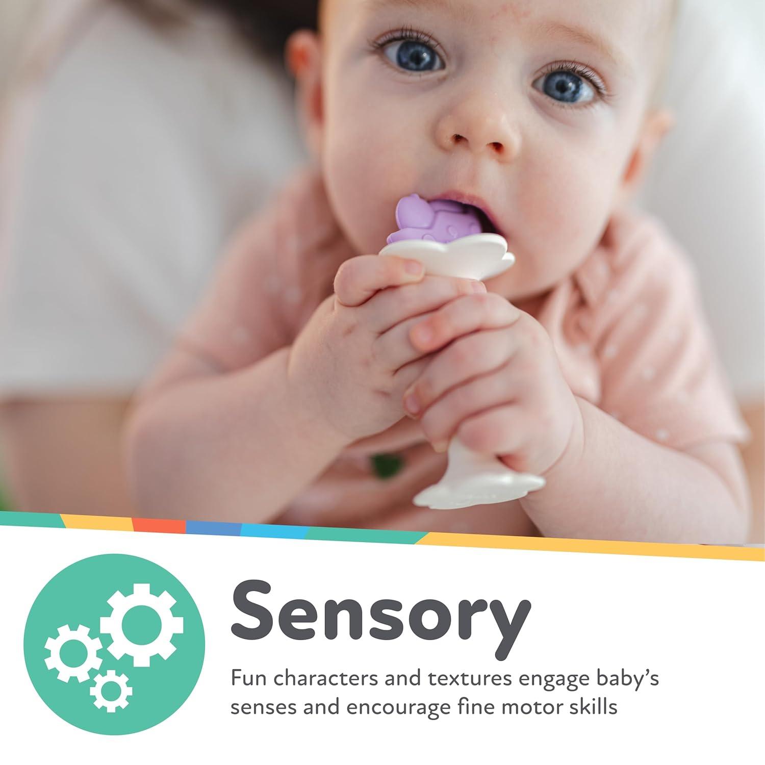 Ease your baby's teething discomfort with Nuby's Silicone Fun Teethers. Designed to make teething easier, these teethers feature multi-textured surfaces that encourage tactile exploration and provide gentle massage to soothe sore gums. Crafted from 100% soft silicone, they offer teething relief without causing discomfort to delicate mouths. The vibrant colors, playful shapes, and intriguing textures of these teething toys appeal to your baby's senses, stimulating both sight and touch. With their perfect size, they are easy for little hands to grasp and hold securely.