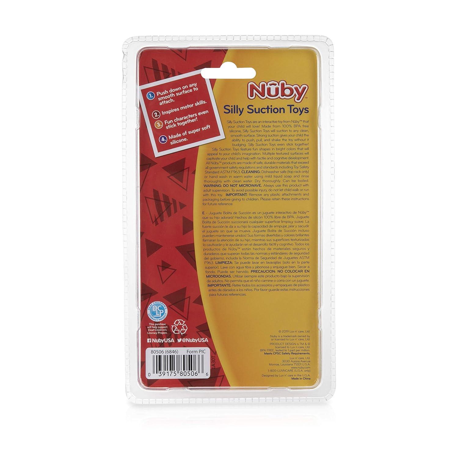 For children, playtime and learning are the same. Silly suction toys are a developmental, interactive toy from Nuby that your child will love! Silly suction toys will suction to any clean, smooth surface. Perfect for playing at home or on-the-go, silly suction toys can stick to tables, highchairs, strollers, and more! Strong suction gives your child The ability to push, pull, and shake the toy without it budging. Silly suction toys even stick together! Silly suction toys feature fun shapes in bright colors that will engage the senses and appeal to your child's imagination. Multiple textured surfaces will captivate your child and help build tactile and cognitive development. Suction cup popping sounds are fun and will catch your child's attention, engaging their hearing. Parents are sure to love that silly suction toys are easy to clean-just pop them in the top rack of the dishwasher! Go ahead, play, learn, and be a little silly!