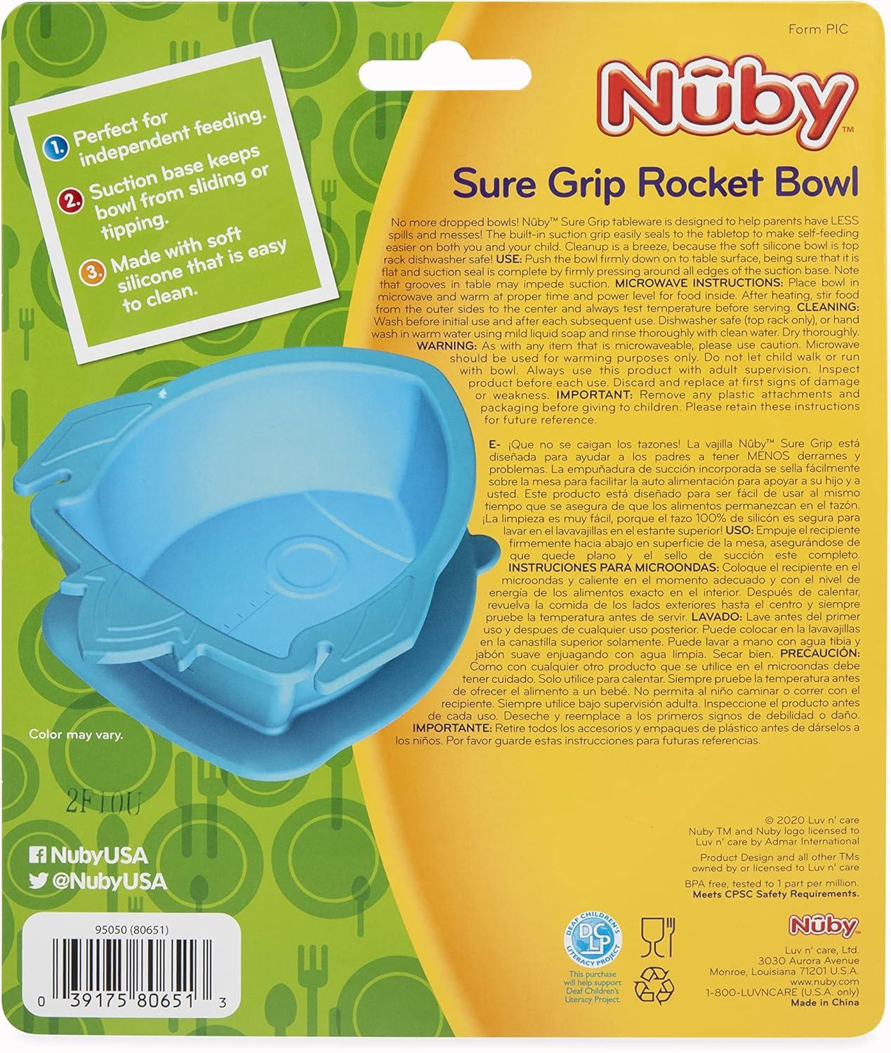 Everybody cries over spilled spaghetti. Mealtimes can be messy business, but not anymore with Nuby’s Sure Grip Rocket Bowl. Our bowl is designed to help parents avoid sticky spills and messes. Create a seal between the bowl's suction-grip base and the tabletop, and rest assured you will be keeping tips, spills, and bumps from spoiling your family meal. Not just convenient at the table, the Sure Grip Rocket Bowl is made from 100% silicone which is BPA-free. Nuby's Sure Grip Rocket Bowl is dishwasher and microwave safe for parents' convenience. That means more time enjoying family meals and less time fretting about cleaning up. The practical and fun rocket design will make every meal out of this world!